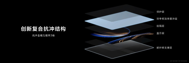 为了增强屏幕的可靠性和平整度,华为引入了创新的复合抗冲结构。非牛顿流体表面层采用多层复合设计,可以有效降低反射率,中间缓冲层使用微米级超薄高分子材料,提升抗冲击能力。高强度碳纤维支撑层以航空级材料为核心,抗形变能力达380GPa,比传统支撑层减轻48%的重量。这些技术融合,让屏幕展开如镜面般平整,闭合时无缝贴合,经得起频繁折叠的考验。
