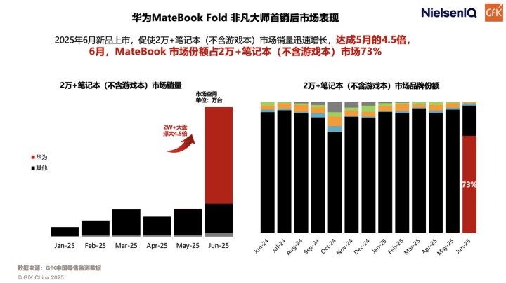 高端笔记本电脑市场正迎来一场变革。GFK内部数据显示,2025年6月,即华为MateBook Fold 非凡大师上市首月股指配资,便强势推动2万元以上笔记本(不含游戏本)市场销量迅速攀升,达到5月的4.5倍。更令人瞩目的是,该机型在该细分市场的份额高达73%,一举成为超高端领域的热门之选。作为华为首款鸿蒙折叠电脑,华为MateBook Fold 非凡大师凭借创新的折叠形态、深度AI能力和轻便高效的设计,不仅获得了消费者的认可,更引领着行业向更具前瞻性的方向发展。
